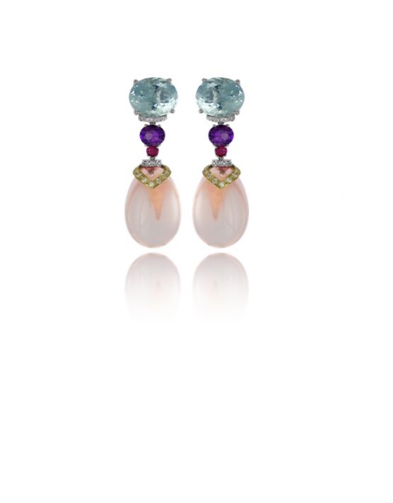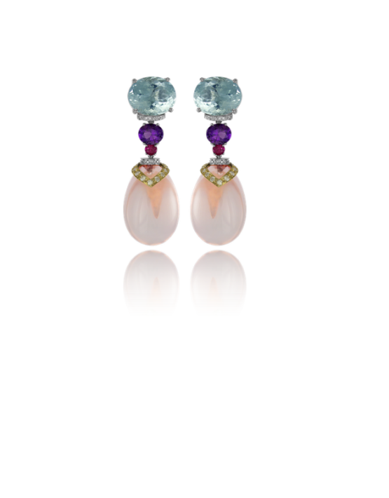 Unbelievably regal, these earrings remind me of La Sala Bianca in The Pitti Palace in Florence where the first Catwalk took place. There’s an elegance to them but in true Annellino style the pop of colour brings them to life. Two Hand cut Aquamarine crown the piece followed by a duo of dark Amethyst and Rubies.