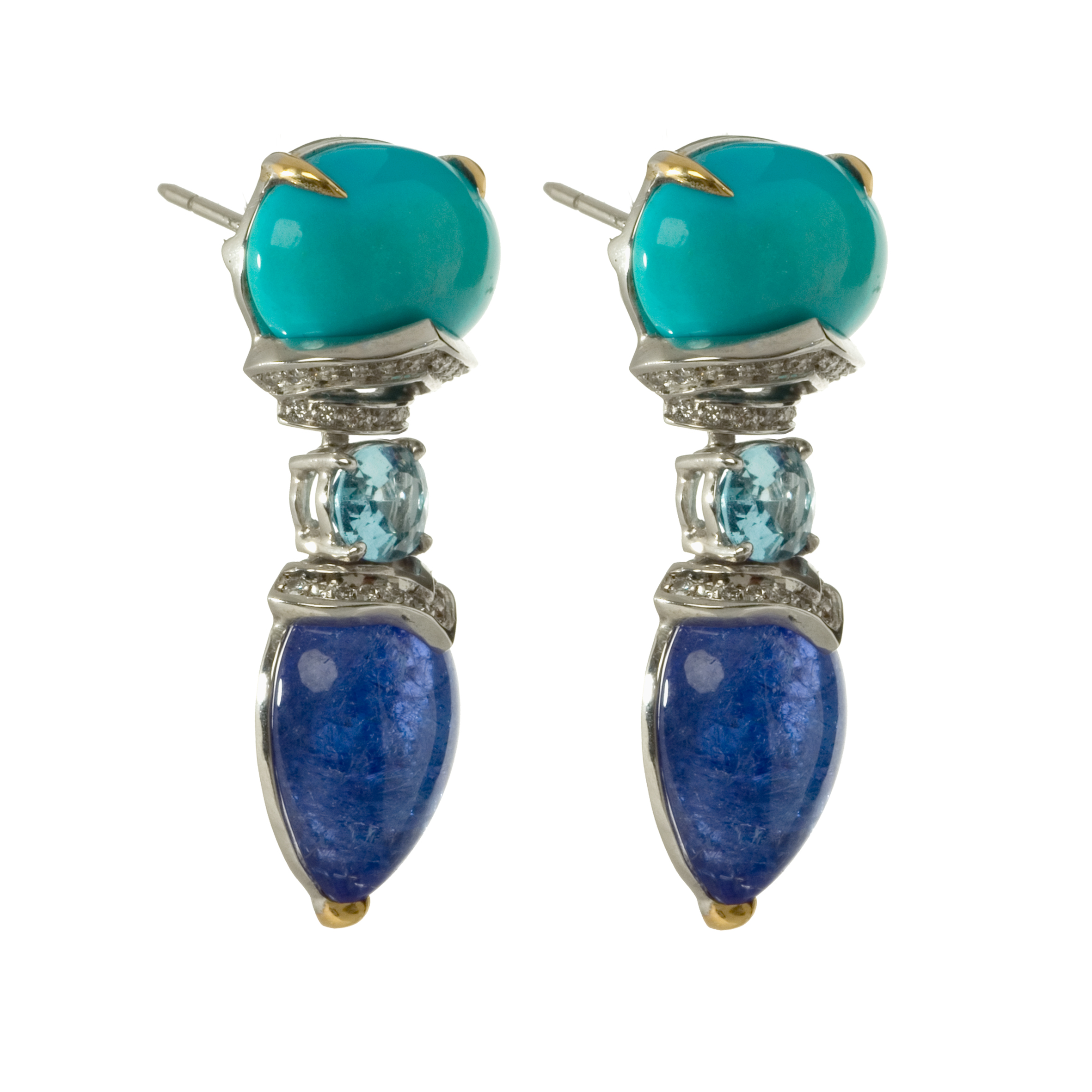 These stunning earring are made up three distinct and empowering stones, each cut in a different way. The Cabochon Cut Turquoise that crowns the Earrings leads onto an Oval Brilliant Cut Aquamarine and then Two White Diamond V Collars surround the Navette Cut Tanzanite.