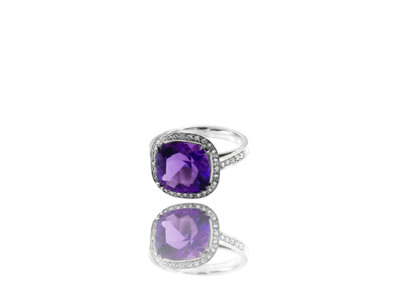 In true Cocktail Ring style this Hand Cushion Cut Amethyst is surrounded by 28 Brilliant Cut White Diamonds and set in 18k White Gold. The halo and shoulder of White VVS-F Diamonds total 0.35ct while the Amethsyt at the centre of this piece is 3.67ct.