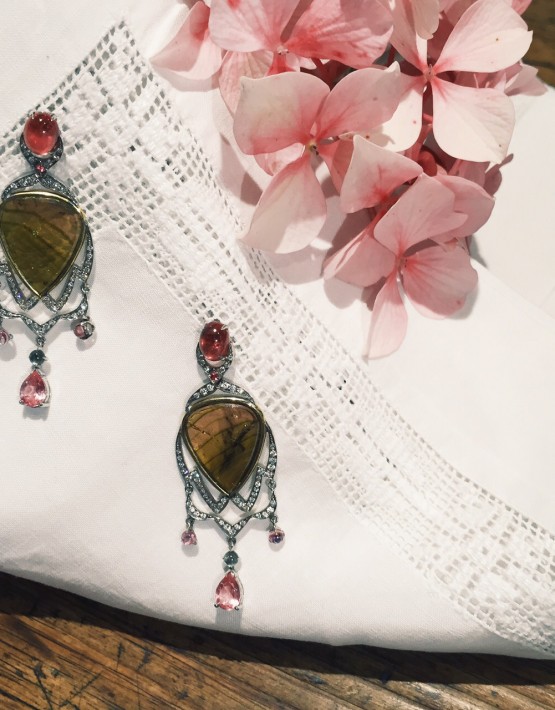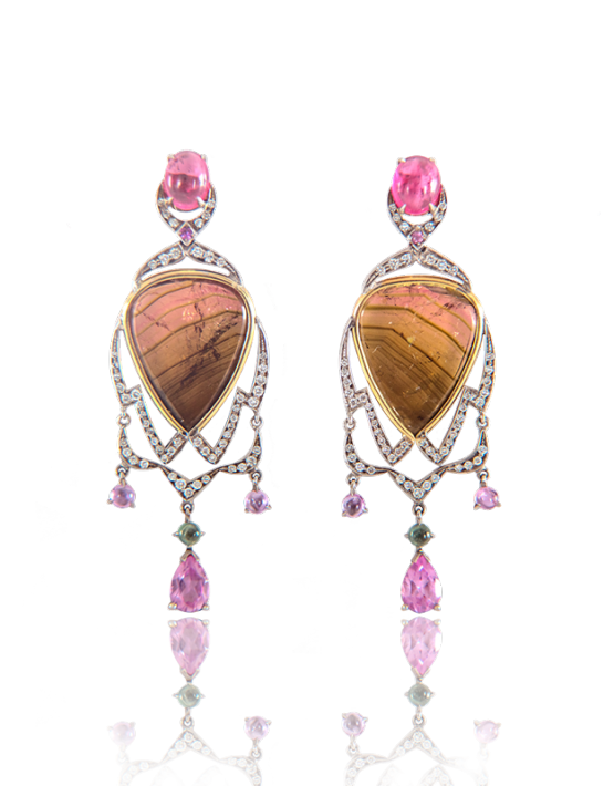 When the light shines, these fairy-tale like earrings resemble the impressive stained glass of Montecassino Abbey. Inspired by this spectacular building these unique earrings were created. 110 White Diamonds and Rose Sapphire and Peridots are set in 18k Yellow Gold to frame the natural Tourmaline.