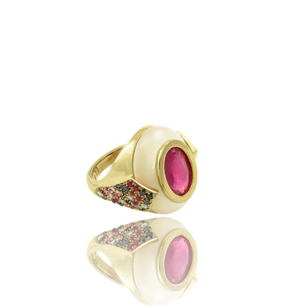 A rose cut Ruby is at the centre of this cocktail ring set in 18k Yellow Gold. A fluted shoulder of multicoloured Sapphires and White Diamonds glide over a Mother of Pearl oval to frame the Ruby.