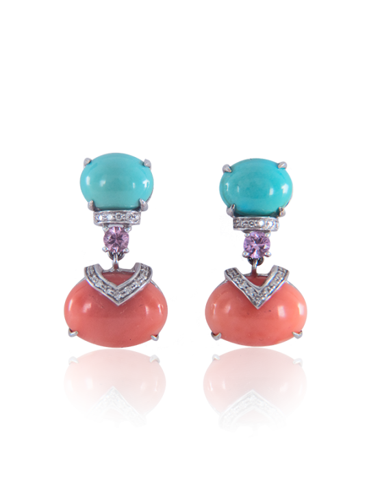 Turquoise and Coral Earrings set with Pink Sapphire and White Diamonds